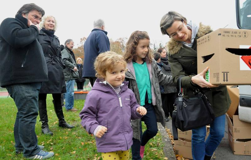 Une poule peut manger jusqu’à 150 kg de déchets organiques et pondre, selon les races, 260 œufs par an. De plus, son fumier, constitué par le mélange de litière et d’excréments, est un excellent engrais naturel. Après une petite information sur le gallinacé assurée au Mille-club, 34 familles sont reparties avec deux poules pondeuses chacune, de couleur rousse (race shaver), âgées de 18 semaines et vaccinées. Venue avec ses grands-parents, Mathilde, 7 ans et demi, a déjà baptisé les deux siennes. « Elles s’appelleront Mathilde et Emma, le prénom de ma sœur ».